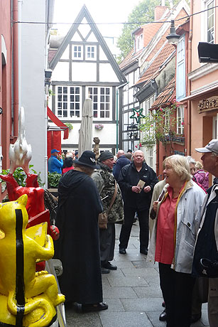 Nach Ankunft in Bremen und einer Stärkung im Gasthof "Zum Kaiser Friedrich", einem gemütlichen Lokal mit norddeutscher Küche in einem Barockhaus, zog es die Gruppe in das älteste Viertel Bremens: das Schnoorviertel aus dem 13. Jahrhundert. Der Name "Schnoor" ist vom niederdeutschen Wort "Snoor", was "Schnur" bedeutet, abgeleitet und bezeichnet die schnurgerade Aufreihung der niedlichen Häuser. Ursprünglich an der Balge, einem Seitenarm der Weser gelegen, wurde es von Flussfischern und Schiffern bewohnt und war ein beliebter Ort für Badestuben.