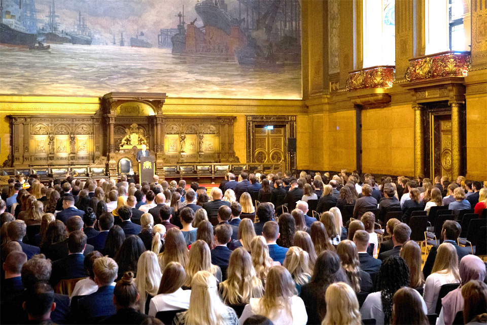 Am 5. Oktober begrüßte Hamburgs Erster Bürgermeister Dr. Peter Tschentscher im Großen Festsaal des Rathauses 255 Nachwuchskräfte der Allgemeinen Verwaltung sowie der Sozialen Arbeit und vereidigte diejenigen, die ihre Ausbildung bzw. ihr Studium im Beamtenverhältnis aufgenommen haben.