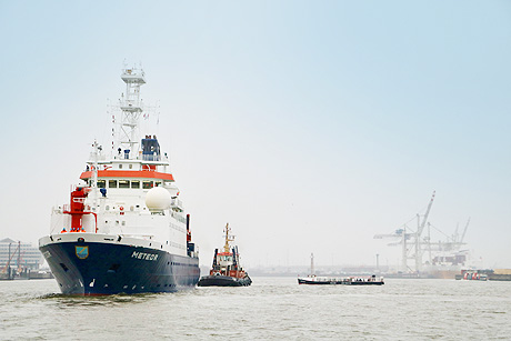 Nach dem "Open Ship" brach die METEOR im Rahmen einer Erprobungsfahrt mit Prof. Hübscher, Kapitän Detlef Korte und seiner erfahrenen Crew auf zu einer Expedition vor der Westküste Afrikas bis nach Walvis Bay, Namibia. Dabei untersuchen die Forscher unter der Leitung von Prof. Hübscher u. a. Prozesse der Plattentektonik, Meeresbodenvulkanismus sowie Unterwasser-Hangrutsche, Sedimentkerne und Wassersäulen. Da Forschungsarbeit teuer ist, wird während der Forschungsreise rund um die Uhr gearbeitet. Die eigentliche Arbeit mit den langwierigen Auswertungen der Proben und Daten erfolgt dann wieder auf dem Festland in der Universität.