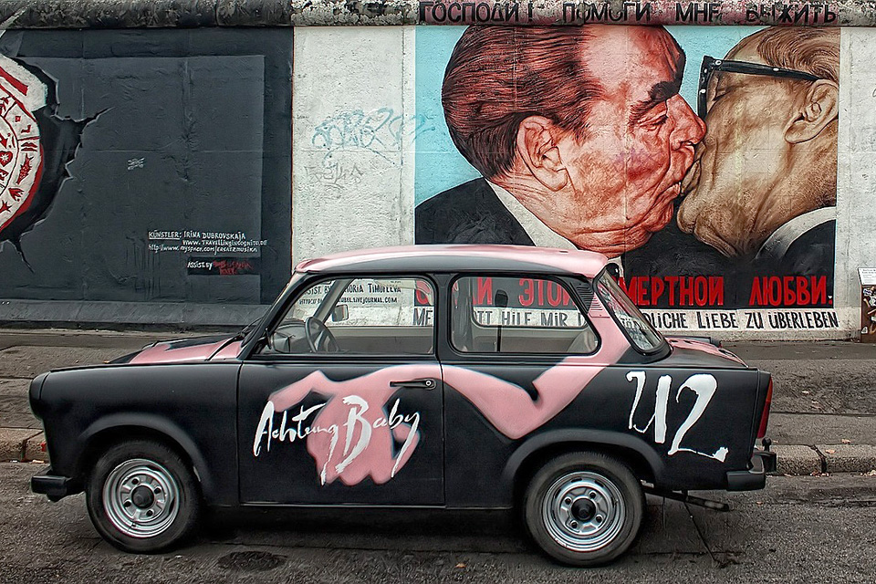 Der die Mauer durchbrechende Trabi, Honeckers und Breschnews Bruderkuss und rund hundert weitere Murals von 118 Künstlern aus 21 Ländern schmücken das mit 1.316 Metern längste erhaltene Teilstück der Berliner Mauer auf der ehemaligen Ostseite. Diese längste Open-Air-Galerie der Welt in der Mühlenstraße zwischen Ostbahnhof und Oberbaumbrücke wurde am 28. September 1990 eröffnet und ein Jahr später unter Denkmalschutz gestellt. Seit ihrem Bestehen wurde sie bereits einmal teilsaniert und einmal komplett restauriert, da sie täglich den Witterungsverhältnissen ausgesetzt ist. Im November 2018 übertrug das Land Berlin die East Side Galley in das Eigentum der Stiftung Berliner Mauer, die sich fortan um den Erhalt des Denkmals bemüht. Die East Side Gallery ist täglich und rund um die Uhr für Besucher frei zugänglich.