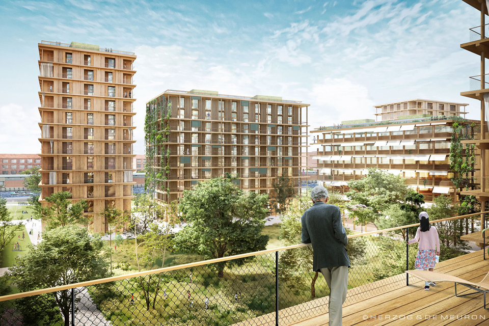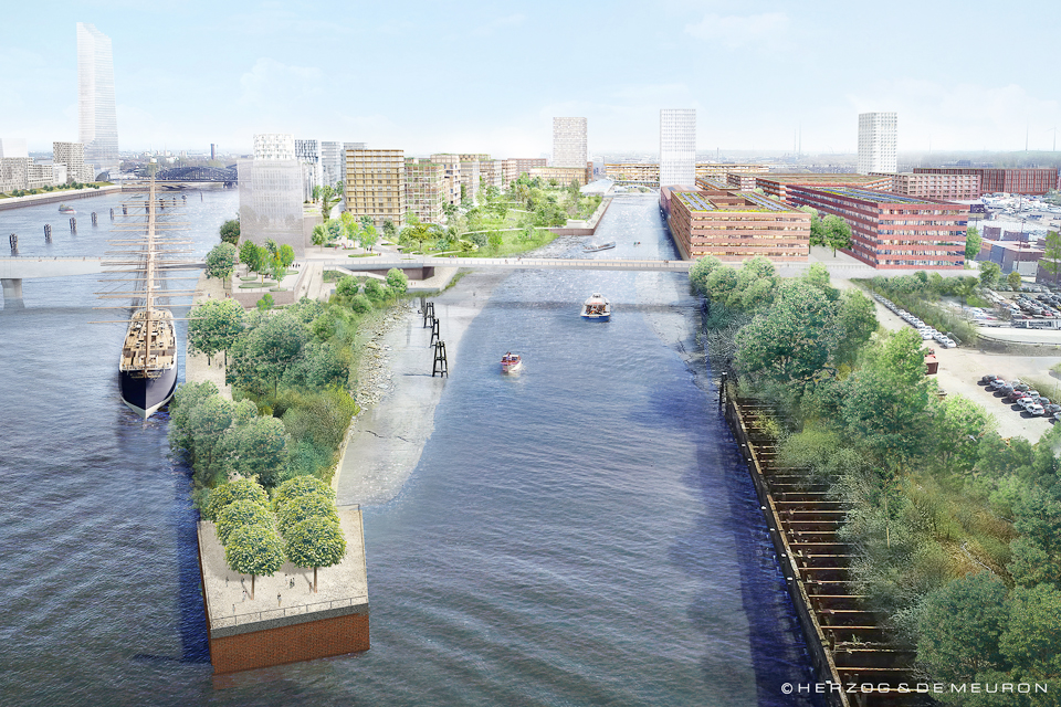 Fotos: Überseezentrum + Grasbrook © Schwarz / stahlpress; Visualisierungen @ Herzog & de Meuron + Vogt Landschaftsarchitekten