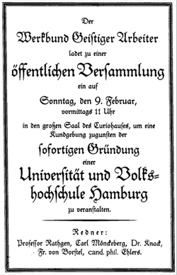 Am 6. November 1918 wehte die rote Fahne der Revolution. Demonstanten besetzten den Elbtunnel, den Hauptbahnhof und andere wichtige Standorte der Stadt. Zu den Forderungen zählten neben einem Ende des Krieges Demokratie und Bildung für alle. Bereits sechs Tage später trafen sich mehr als 3.000 Lehrer im Curiohaus, um über die Bildung der Zukunft zu diskutieren. Man war sich einig, dass was für Kinder gilt, auch für Erwachsene jedes Standes möglich sein muss. Bei der ersten freien Bürgerschaftswahl am 16. März 1919 gewann die SPD und setzte sich im Parlament gleich dafür ein, eine Volkshochschule einzurichten. Die Idee dahinter: Aufgeklärte, mündige, gebildete Bürger lieben die Republik mehr als den Obrigkeitsstaat. Am 28. März 1919 verabschiedeten die Abgeordneten Gesetze, mit denen sie die Volkshochschule und die Universität gründeten.