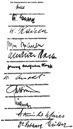 Grundgesetz für die Bundesrepublik Deutschland 1949, Faksimile der Seite mit den Ratifikationsunterschriften, für Hamburg der Erste Bürgermeister Max Brauer