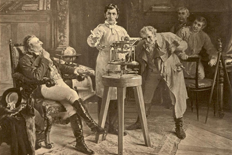 Bild oben: Heroisierendes Gemälde Rudolf Wimmers von 1897: Fraunhofer (Mitte) demonstriert das Spektroskop. Links: Joseph von Utzschneider, rechts: Georg Friedrich von Reichenbach, Foto: Gemeinfrei via Wikimedia Commons aus Essays in astronomy, D. Appleton & company, 1900