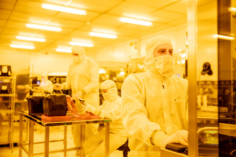 Bild oben: Wissenschaftlerinnen und Wissenschaftler bei der Waferbearbeitung (runde Halbleiter) im Bereich Lithographie im MEMS-Reinraum (Miniaturisierte Mikrosysteme) des ISIT in Itzehoe, Foto: © 2020 Eric Shambroom Photography / Fraunhofer ISIT