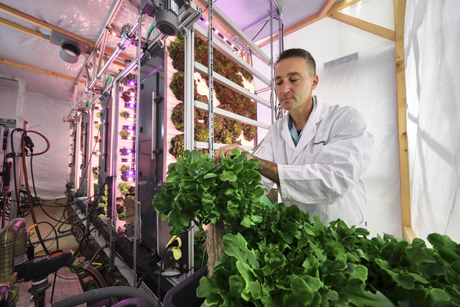 Bild oben: Das am Fraunhofer IME entwickelte vertikale Indoor-Pflanzenzuchtsystem OrbiPlant® ermöglicht einen nachhaltigen und ressourcenschonenden Anbau von Medizin- und Nahrungspflanzen, Foto: © Fraunhofer IME / Christian Ahrens