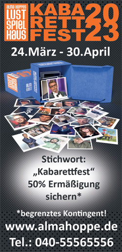 Das Kabarettfest in Alma Hoppes Lustspielhaus, Hamburgs größtem Kabarett-Theater, hat Tradition. Es ist regelmäßig ein Feuerwerk kabarettistischer Highlights, in diesem Jahr abgefeuert vom 24. März bis zum 30.April.